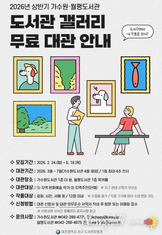 뉴스펀치 이현승 기자 | 대전 서구 가수원·월평도서관은 내달 3월부터 지역 문화예술 작가와 주민들을 대상으로 갤러리 무료 대관 서비스를 제공한다.
