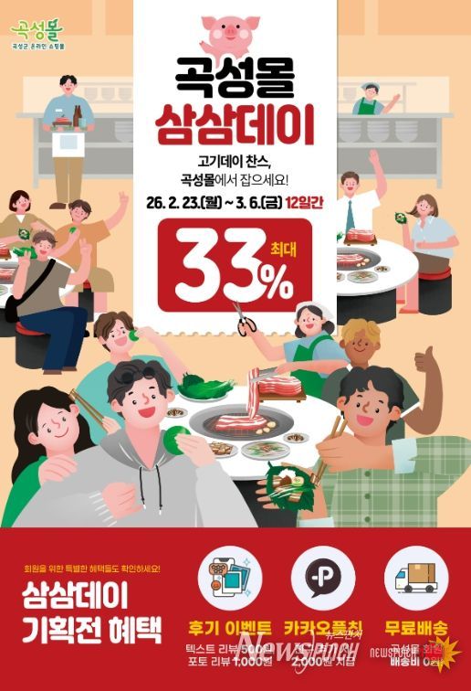 뉴스펀치 최영남 기자 | 전남 곡성군은 3월 3일 삼겹살데이를 맞아 곡성군 공식 온라인 쇼핑몰 ‘곡성몰’에서 ‘삼삼데이 특별전’을 운영한다고 23일 밝혔다.