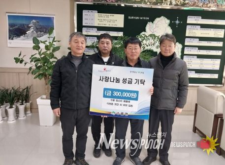 뉴스펀치 김수동 기자 | 수륜면 흥소리 풍물패 회원일동은 12.27 행정복지센터를 방문하여 관내 저소득층 및 독거노인에게 전달해 달라며 사랑나눔 성금 30만원을 기탁했다.