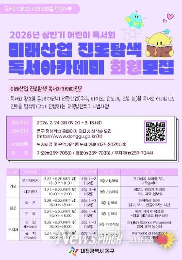 뉴스펀치 이현승 기자 | 대전 동구는 지역 내 공공도서관인 가오·용운·무지개도서관에서 2026년 상반기 독서회 ‘미래산업 진로탐색 독서아카데미’를 운영하며, 이달 24일부터 참여 회원을 모집한다고 밝혔다.