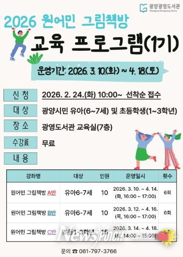 뉴스펀치 최영남 기자 | 광양광영도서관은 오는 3월 10일부터 9월 12일까지 유아 및 초등 저학년을 대상으로 '2026년 원어민 그림책방'을 운영한다.