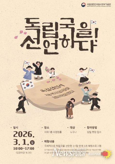 뉴스펀치 정홍균 기자 | 국가보훈부는 제107주년 3·1절을 맞아 3·1운동에서 독립선언 과정을 체험할 수 있는 체험프로그램과 문화행사가 국립대한민국임시정부기념관(서울 서대문구)에서 다채롭게 펼쳐진다고 밝혔다.