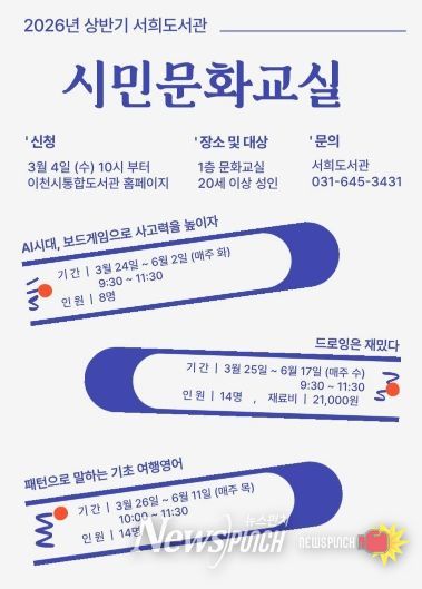 뉴스펀치 박상훈 기자 | 이천시 서희도서관이 지역 주민들의 문화적 소양을 높이고 배움의 즐거움을 나누기 위해 ‘2026년 상반기 시민문화교실’을 운영하고 성인 수강생을 모집한다고 밝혔다.