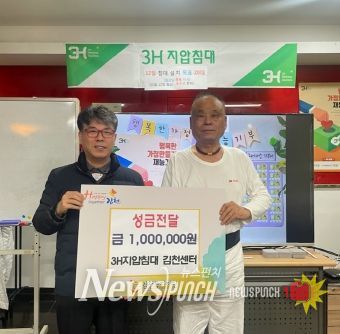 뉴스펀치 김수동 기자 | 김천복지재단은 27일 3H지압침대 김천센터로부터 이웃돕기 성금 100만 원을 전달받았다고 밝혔다.