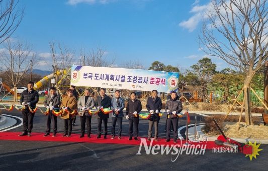 뉴스펀치 김수동 기자 | 김천시는 12월 26일 부곡동 자이 아파트 인근 기반 시설 조성 공사 현장에서 도의원, 지역구 시의원, 이용 주민들이 참석한 가운데 부곡 도시계획시설 조성 공사 준공식을 개최했다.