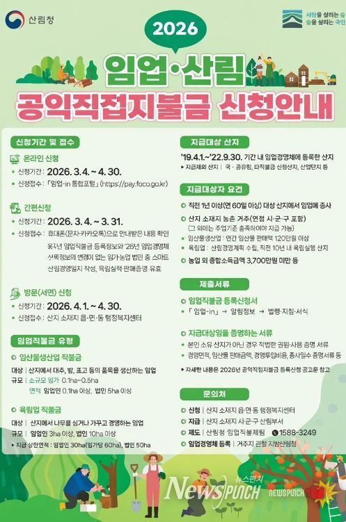 뉴스펀치 김용희 기자 | 여수시는 2026년 임업‧산림 공익직접지불금 신청을 3월 4일부터 4월 30일까지 접수한다고 밝혔다.