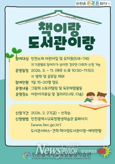 뉴스펀치 정홍균 기자 | 인천광역시교육청평생학습관은 오는 27일부터 ‘책이랑 도서관이랑’ 프로그램에 참여할 인천 관내 유치원과 어린이집을 모집한다.