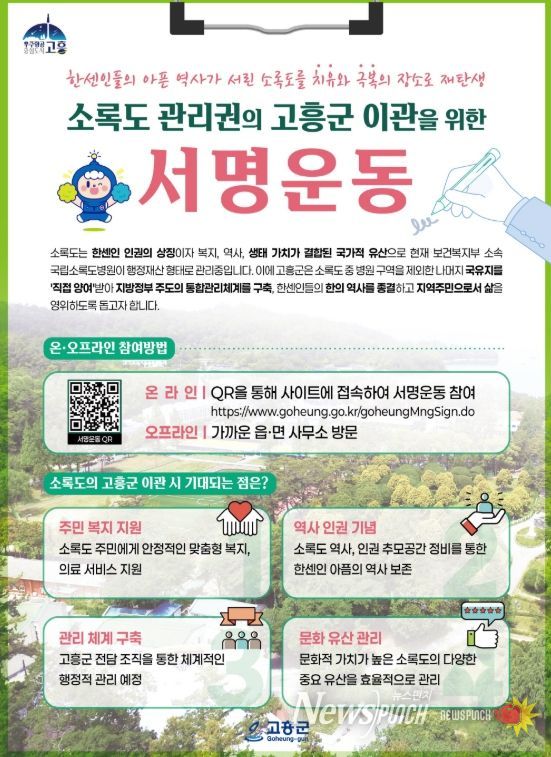 뉴스펀치 김용희 기자 | 고흥군은 소록도 관리권의 조속한 이관을 촉구하기 위해 서명운동을 본격 추진한다고 25일 밝혔다.