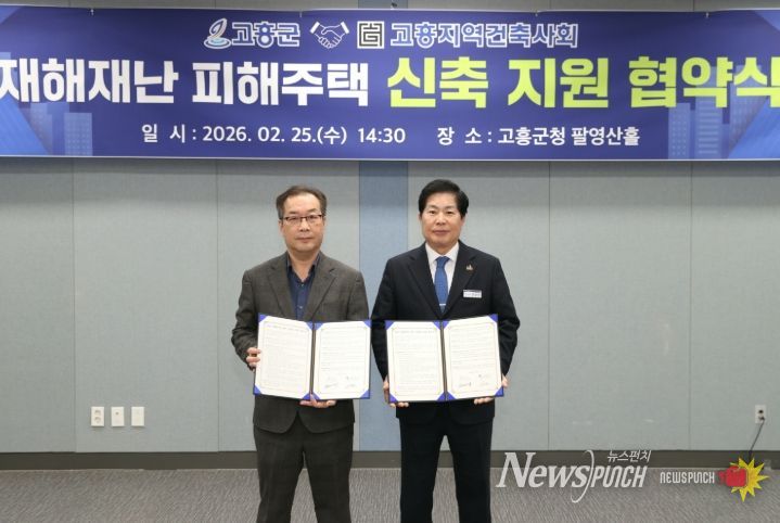 뉴스펀치 김용희 기자 | 고흥군은 지난 25일 군청 팔영산홀에서 고흥지역건축사회(이하 건축사회)와 재난 피해주택 지원을 위한 업무협약을 체결했다고 밝혔다.