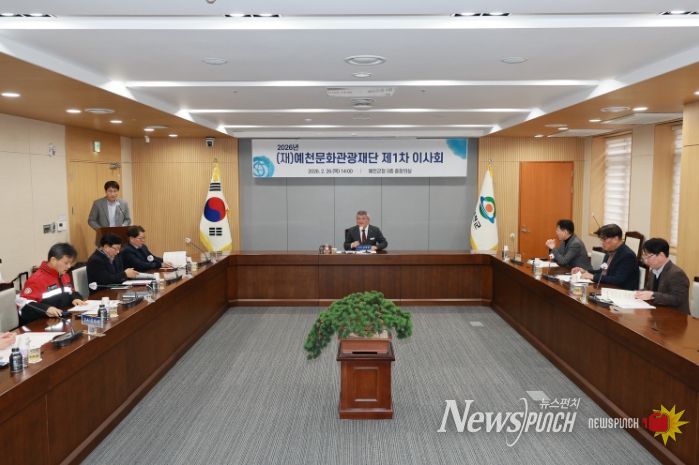 뉴스펀치 박세훈 기자 | 예천문화관광재단(이사장 김학동)은 26일 오후 2시 군청 중회의실에서 2026년도 제1차 이사회를 개최하고 2025회계연도 법인회계 결산, 제규정 개정, 2026년도 제1회 추가경정예산 등 총 3건의 안건을 심의·의결했다.