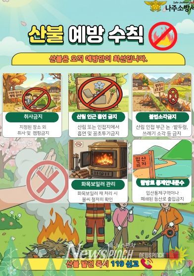 또한 나주시청, 경찰 등 유관기관과 협력하여 산불 예방 캠페인을 전개, 주민 대상으로 산불 예방 행동 요령 카드뉴스와 전단지 배부, 농부산물․쓰레기 소각 금지 산불 예방 수칙 홍보를 강화해 경각심을 높일 계획이다.