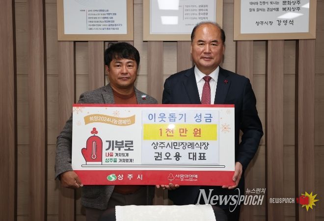 뉴스펀치 김수동 기자 | 상주시민장례식장(은 12월 27일 연말에 소외된 이웃을 위한 지역 내 사랑 나눔확산과 지역기업의 사회적 책임강화 차원으로 ‘희망2024 나눔캠페인’ 이웃돕기 성금 1,000만 원을 신흥동 행정복지센터(동장 이종진)에 기탁했다.