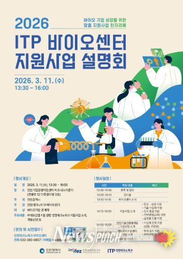 뉴스펀치 조평훈 기자 | 인천테크노파크(인천TP)와 인천시는 오는 3월 11일 오후 2시 송도 미추홀타워 3층에서 ‘2026년도 바이오센터 지원사업 설명회’를 개최한다고 밝혔다.