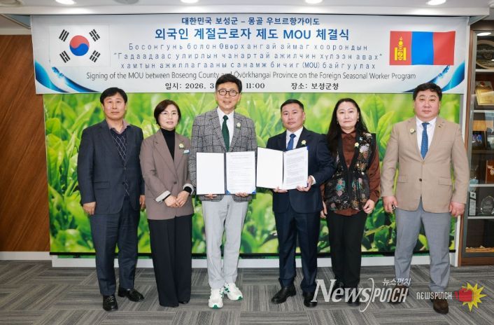뉴스펀치 최영남 기자 | 보성군은 4일 군청에서 몽골 우브르항가이도와 외국인 계절근로자 제도의 안정적인 운영을 위한 업무협약(MOU)을 체결했다고 밝혔다.