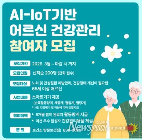 뉴스펀치 최영남 기자 | 고흥군은 지역 어르신의 만성질환 예방과 건강 증진을 위해 ‘AI·IoT 기반 어르신 건강관리사업’ 신규 참여자를 모집한다고 밝혔다.