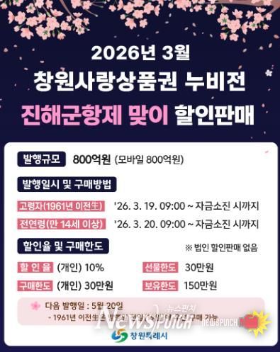 뉴스펀치 박세훈 기자 | 창원특례시는 봄맞이 대표 축제인 진해군항제를 앞두고 관광객 소비를 지역 상권으로 연결하기 위해 800억 원 규모의 ‘모바일 창원사랑상품권(누비전)’을 발행한다고 4일 밝혔다.