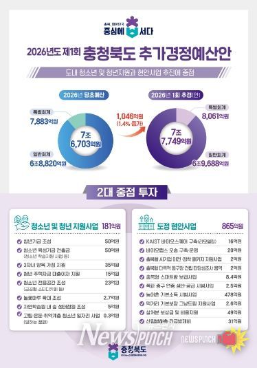뉴스펀치 강영선 기자 | 충북도는 도민 체감형 위주의 사업 지원 및 상반기 추진이 시급한 역점사업 추진을 위해 1,046억원 규모의 제1회 추가경정예산안을 3월 3일 충청북도의회에 제출했다.