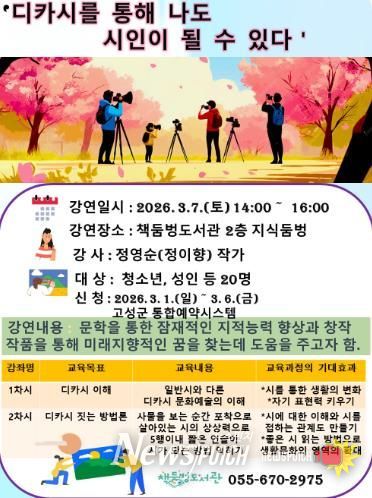이번 강연은 청소년 및 성인 20명을 대상으로 하며, 신청은 오는 3월 6일까지 고성군 통합예약시스템을 통해 선착순으로 접수한다.