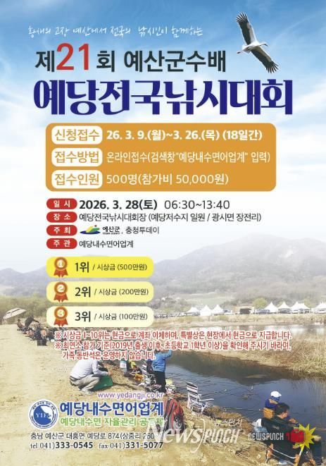 뉴스펀치 이현승 기자 | 예산군은 오는 3월 28일 예당전국낚시대회장에서 ‘제21회 예산군수배 예당전국낚시대회’를 개최한다고 밝혔다.