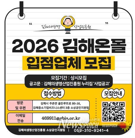 한편, 입점 신청은 김해의생명산업진흥원 누리집 ‘사업공고’를 통해 확인 가능하며, 자세한 사항은 진흥원 소상공인지원팀으로 문의하면 된다.