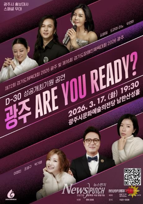 뉴스펀치 박상훈 기자 | 광주시문화재단은 오는 17일 ‘제72회 경기도체육대회 및 제16회 경기도장애인체육대회 2026 광주’의 성공 개최를 기원하고 대회 개막 30일 전을 기념하는 ‘광주 ARE YOU READY?’ 공연을 개최한다고 6일 밝혔다.
