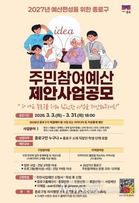 또한 실효성 있는 제안 발굴을 위해 3월 13일 14시부터 17시까지 웰니스센터(율곡로 89)에서 ‘2026년 종로구 주민참여예산학교’를 개최한다.