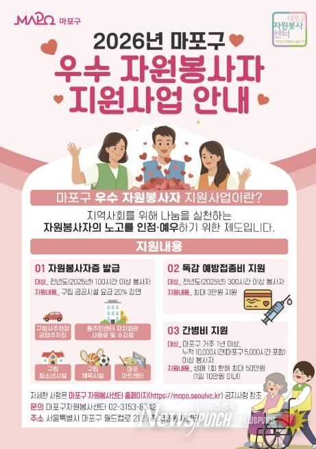뉴스펀치 박상훈 기자 | 마포구가 자원봉사자의 노고와 헌신에 보답하고 자원봉사 참여 문화를 확산하기 위해 올해부터 우수 자원봉사자를 대상으로 ‘인플루엔자 예방접종비’와 ‘간병비’를 새롭게 지원한다.