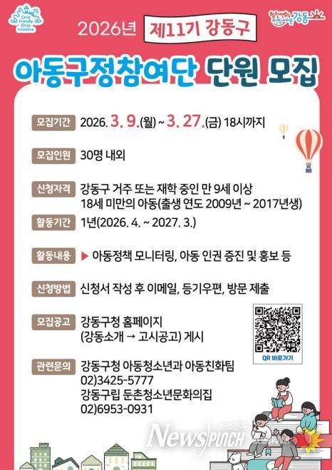 뉴스펀치 박상훈 기자 | 서울 강동구는 3월 9일부터 27일까지 아동정책 모니터링과 아동 권리 증진 활동을 이끌어갈 ‘제11기 강동구 아동구정참여단’을 모집한다고 9일 밝혔다.
