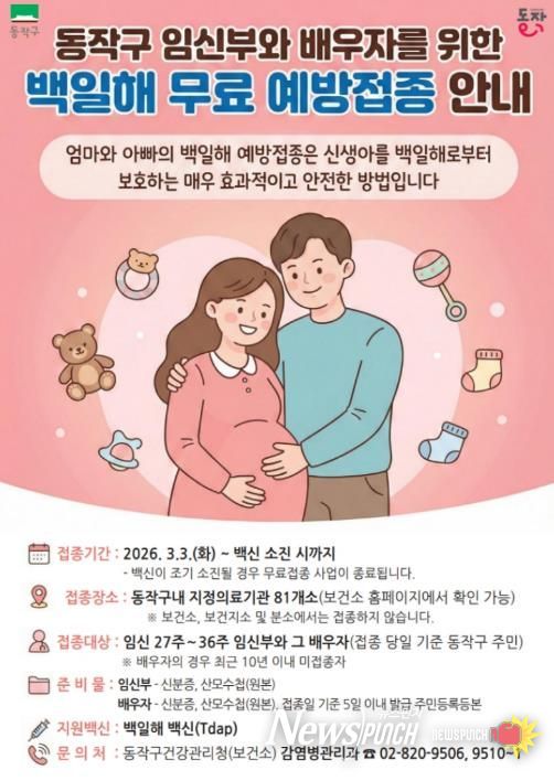 백일해 무료 예방접종은 접종일 기준 동작구에 주민등록이 돼있는 임신 27~36주 임신부와 임신부의 배우자를 대상으로 하며, 3월 3일부터 백신 소진 시까지 운영한다.
