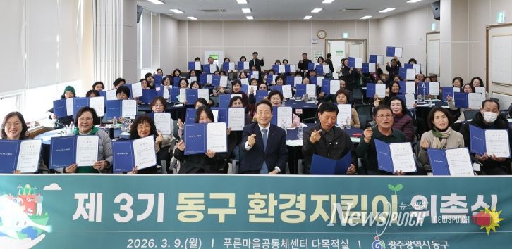 뉴스펀치 최영남 기자 | 광주 동구는 지난 9일 푸른마을공동체센터에서 쾌적하고 건강한 지역 환경 조성을 위해 ‘제3기 동구 환경지킴이’ 위촉식을 개최하고 본격적인 활동에 나선다고 밝혔다.