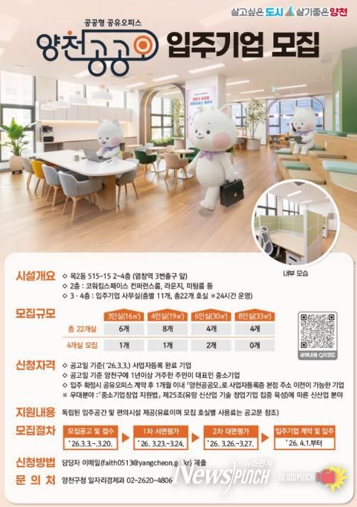 뉴스펀치 박상훈 기자 | 양천구는 지역 내 유망한 창업기업의 안정적인 성장을 지원하기 위해 ‘양천 공공형 공유오피스(이하 양천공공오)’의 잔여 공실에 입주할 기업을 오는 20일까지 공개 모집한다고 11일 밝혔다.