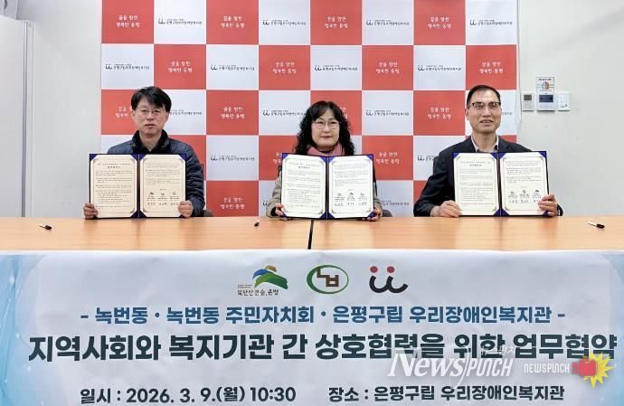 뉴스펀치 박상훈 기자 | 서울 은평구 녹번동은 지난 9일 구립 우리장애인복지관과 지역사회와 복지기관 간 상호 협력을 위한 업무협약을 체결했다고 밝혔다.