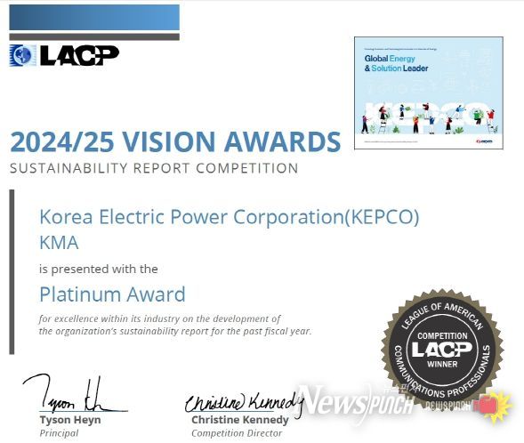 뉴스펀치 최영남 기자 | 한국전력의 지속가능경영보고서가 미국 커뮤니케이션 연맹 LACP(League of American Communications Professionals)가 주최하는 '2024/25 비전어워드(Vision Awards)'유틸리티 분야에서 2016년 이후 10년 만에 최고 등급인'대상(Platinum)'을 수상했다.