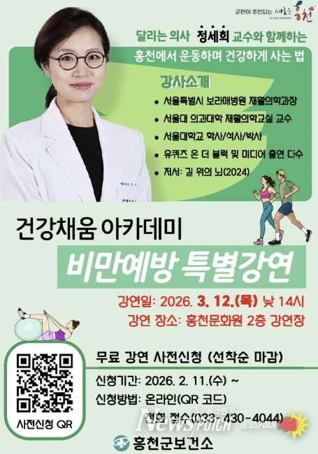 뉴스펀치 조평훈 기자 | 홍천군은 오는 3월 12일 오후 1시 30분 홍천문화원에서 지역 주민 200여 명을 대상으로 건강 강좌를 개최한다.