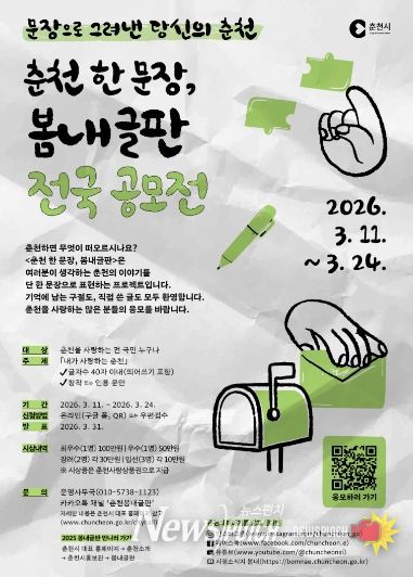 올해 1분기 공모 주제는 ‘내가 사랑하는 춘천’으로 춘천시민뿐 아니라 전 국민 누구나 참여할 수 있다. 형식 제한 없이 40자 이내의 창작 또는 인용 글이면 자유롭게 응모가 가능하다. 접수는 3월 24일까지 온라인(구글폼)과 우편을 통해 진행된다. 공모전 공고와 접수 링크는 춘천시 대표 홈페이지와 인스타그램 또는 페이스북 공식 SNS 채널에서 확인할 수 있다.