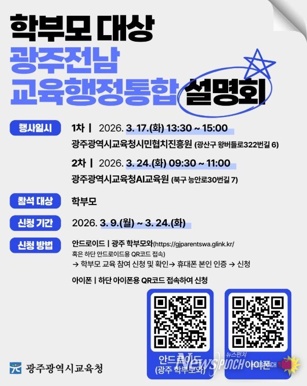 뉴스펀치 최영남 기자 | 광주시교육청이 학부모의 교육행정통합 궁금증을 해소하기 위해 두 차례에 걸쳐 ‘광주·전남 교육행정통합 설명회’를 개최한다.