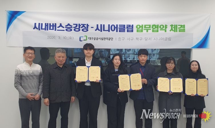 뉴스펀치 조평훈 기자 | 대구공공시설관리공단(이사장 문기봉) 시내버스유개승강장은 지난 3월 10일(화), 시내버스유개승강장 사무실에서 지역 4개 시니어클럽과 업무협약을 체결했다.