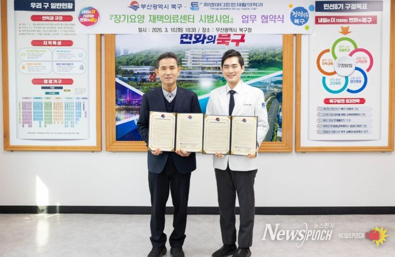 뉴스펀치 김윤걸 기자 | 부산 북구는 지난 10일 화명마디튼튼재활의학과의원과 ‘장기요양 재택의료센터’ 운영을 위한 업무협약(MOU)을 체결했다고 밝혔다.