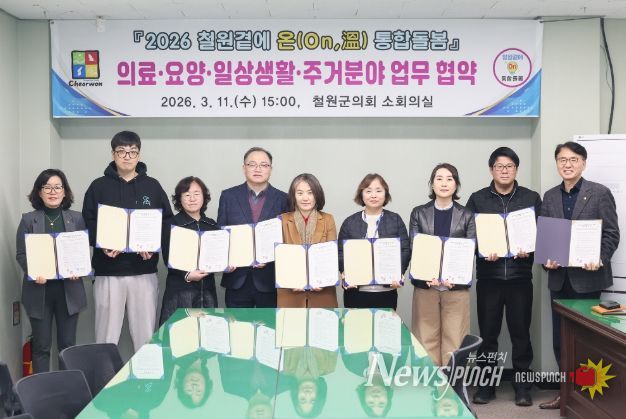 뉴스펀치 조평훈 기자 | 철원군은 3월 11일 철원군의회 소회의실에서 의료·요양·일상생활·주거 등 통합돌봄 4대 분야 서비스 연계 강화를 위한 업무협약식을 개최했다.