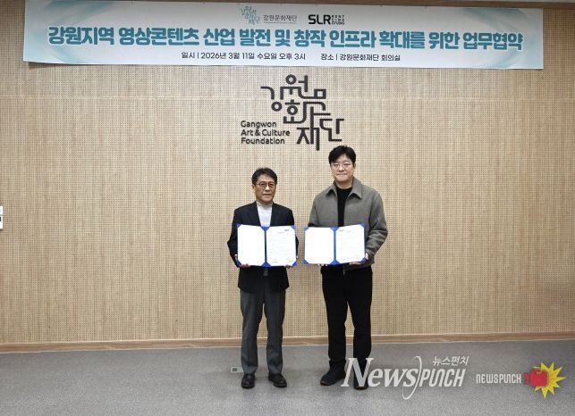 뉴스펀치 조평훈 기자 | 강원문화재단(대표이사 신현상)은 11일 오후 3시 재단 회의실에서 강원지역 영상문화 향유 저변확대와 영상제작 협력 네트워크 구축을 위해 전문 촬영장비 대여업체인 '에스엘알(SLR)렌트'와 업무협약을 체결했다.