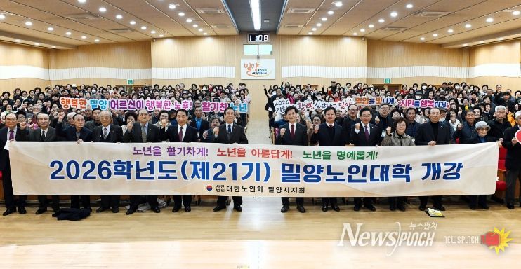 뉴스펀치 박세훈 기자 | (사)대한노인회 밀양시지회(지회장 신준철)는 11일, 밀양시청 대강당에서 입학생 410명과 내빈들이 참석한 가운데 ‘제21기 밀양노인대학 입학식’을 성황리에 개최했다.