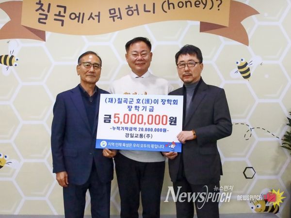뉴스펀치 김수동 기자 | 경일교통㈜, 지난 28일 지역인재육성과 교육발전을 위해 써달라며 호이장학금 5,000,000원을 (재)칠곡군호이장학회에 기탁했다.