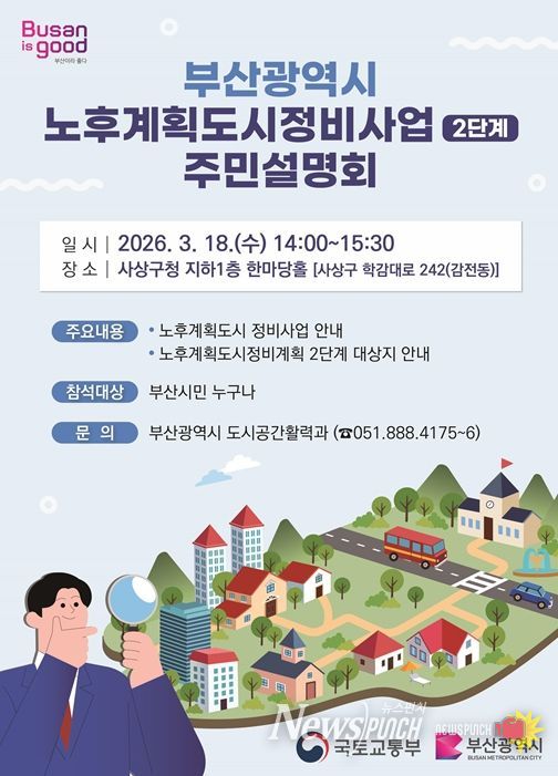 뉴스펀치 김윤걸 기자 | 부산시는 국토교통부 및 정비지원기구와 함께 오는 3월 18일 오후 2시 사상구청 한마당홀에서 노후계획도시정비 2단계 사업 주민설명회를 개최한다고 밝혔다.