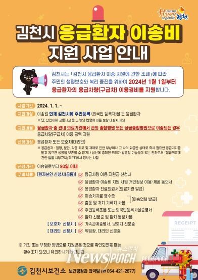 뉴스펀치 김수동 기자 | 김천시는 2024년 1월 1일부터 시민의 생명 보호와 복리 증진을 위해 응급환자 이송비 지원 사업을 시행한다.