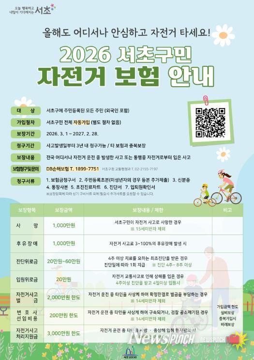 구민들의 예기치 못한 자전거 사고를 대비한 ‘서초구민 자전거 보험’도 올해 3월부터 운영된다. 보험 기간은 2026년 3월부터 2027년 2월까지로, 사고 당시 서초구에 주민등록이 되어 있는 구민이라면 별도 가입 절차 없이 자동으로 가입된다. 전국 어디에서 자전거 사고가 발생해도 보장을 받을 수 있으며, 발생일로부터 3년 이내 보험금 청구가 가능하다. 주요 보장 내용은 ▲사망 및 후유장애 최대 1,000만원 ▲4주 이상 치료 시 진단위로금 20~60만원 ▲입원위로금 20만원 ▲벌금 최대 2,000만원 ▲변호사 선임비용 최대 200만원 ▲교통사고 처리 지원금 최대 3,000만원 등 이다. 2018년부터 8년 동안 총 1,191명의 주민이 4억 6천여만원의 보상을 받은 바 있다. 보험금 청구는 DB손해보험을 통해 관련 증빙서류를 제출하면 된다.