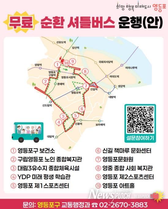 뉴스펀치 박상훈 기자 | 영등포구가 관내 공공시설 접근성을 높이고 교통약자의 이동 편의를 증진하기 위해 ‘공공시설 무료 셔틀버스’ 도입을 추진하고, 본격적인 운행에 앞서 주민 대상 설문조사를 실시한다.