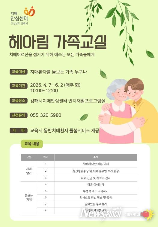 허목 김해시치매안심센터장은 “치매 돌봄은 환자뿐 아니라 가족의 삶에도 큰 영향을 미치는 일”이라며 “가족교실을 통해 치매를 이해하고 돌봄 방법을 배우는 것은 물론 보호자 스스로를 돌보는 시간도 되길 바란다”고 말했다.