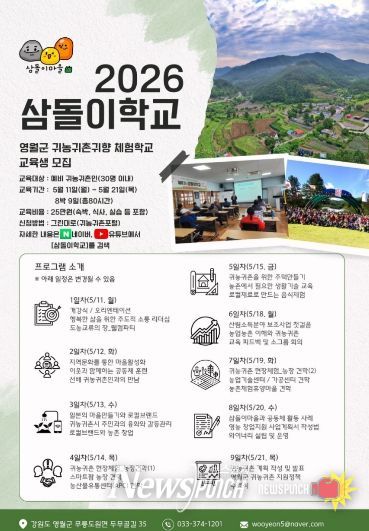 뉴스펀치 조평훈 기자 | 영월군은 예비 귀농·귀촌인의 안정적인 농촌 정착을 돕기 위해 '2026년 영월군 귀농·귀촌 체험학교' 교육생을 모집한다.