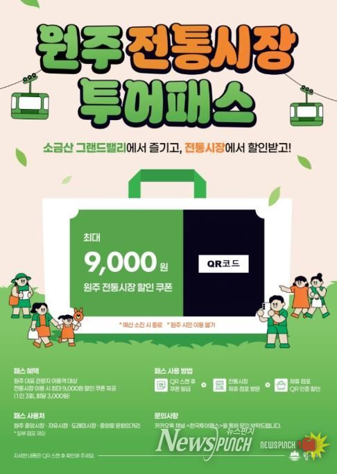 뉴스펀치 조평훈 기자 | 원주시는 서부권의 주요 관광지와 원도심 전통시장을 잇는 ‘원주 전통시장 투어패스’를 오는 13일부터 본격적으로 운영한다. 이번 사업은 소금산 그랜드밸리와 뮤지엄산 등 원주 서부권에 집중된 관광객을 원도심으로 자연스럽게 유도해 전통시장에 활력을 불어넣기 위해 마련됐다.