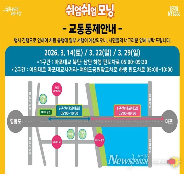뉴스펀치 박상훈 기자 | 서울시는 3월 14일 오전 7시부터 9시까지 차량 위주로 사용되던 도심 도로 공간을 시민들에게 개방하는 서울형 생활체육 프로그램 ‘쉬엄쉬엄 모닝’을 여의도공원 일대에서 처음 선보인다. 시민들은 걷기·달리기·자전거는 물론 유아차나 반려동물과 함께 각자의 방식으로 행사에 자유롭게 참여할 수 있다.